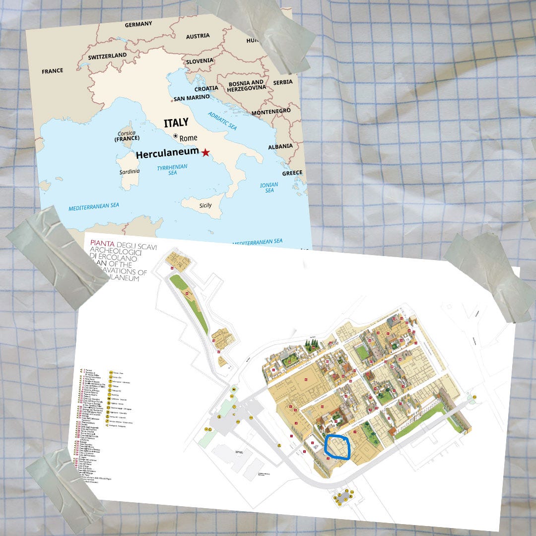 Image 1: screenshot of map of Italy taken from Britannica: https://www.britannica.com/place/Herculaneum; map of the excavations in Herculaneum, taken from Foodie Explorers: https://www.foodieexplorers.co.uk/wp-content/uploads/2019/02/Plan-Herculaneum.jpg