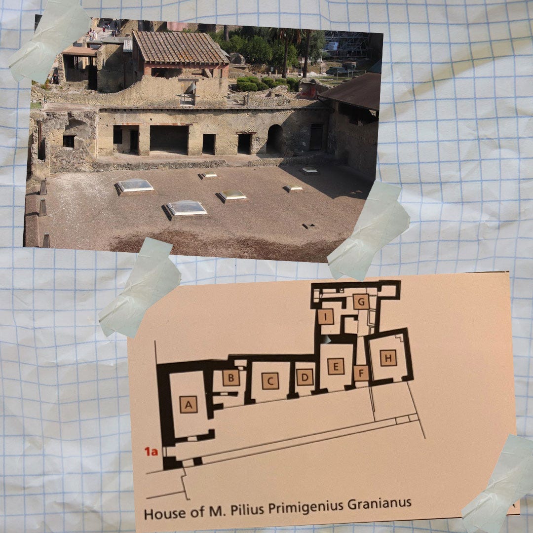 Image 4: floor plan taken from Herculaneum Guide book, p.41; photography of the house, taken from Herculaneum in Pictures: https://herculaneum.uk/Ins%20Or%201/Herculaneum%20Ins%20Or%201%2001a.htm